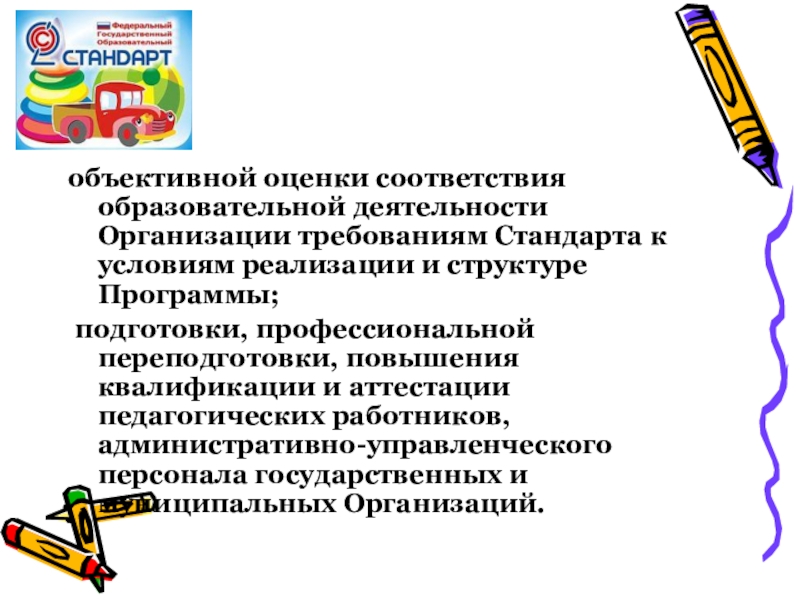 Слайд 5объективной оценки соответствия образовательной деятельности Организации требованиям Стандарта к условиям реализации