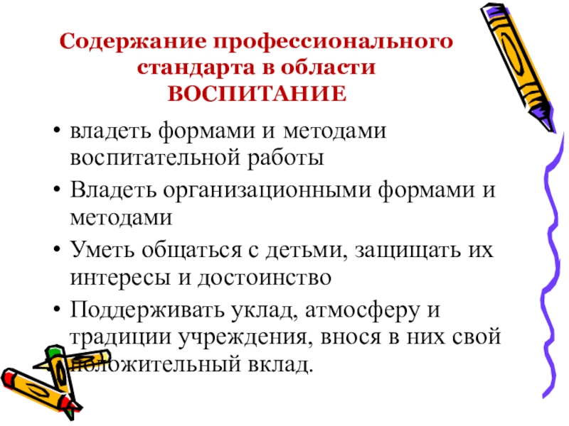 Слайд 19Содержание профессионального стандарта в области ВОСПИТАНИЕ
