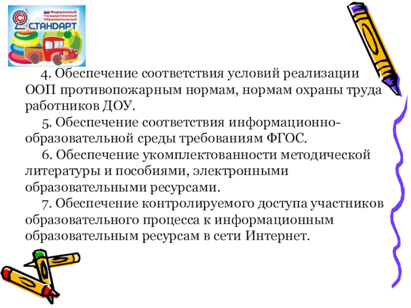 Слайд 13 4. Обеспечение соответствия условий реализации ООП противопожарным нормам, нормам охраны