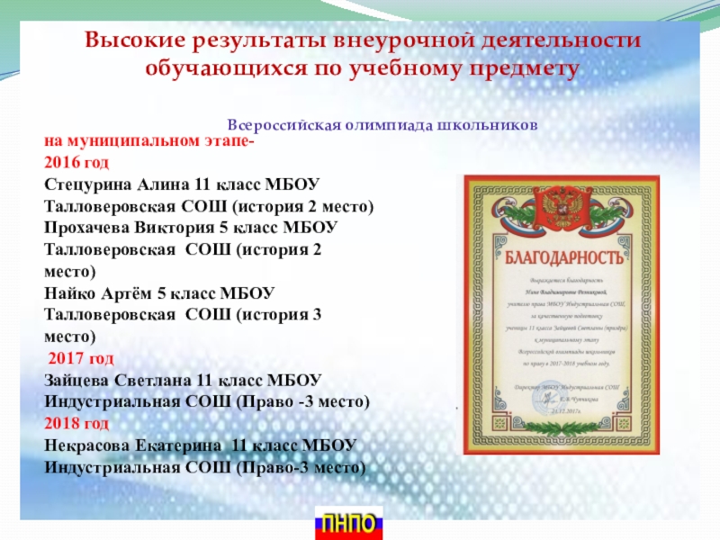 Слайд 16Высокие результаты внеурочной деятельности обучающихся по учебному предмету