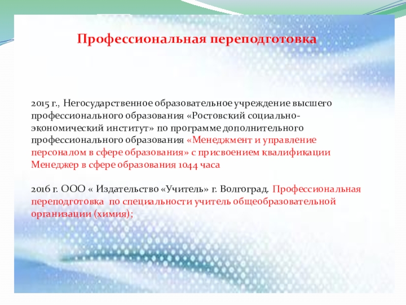 2016 г. ООО « Издательство «Учитель» г. Волгоград. Профессиональная переподготовка по специальности учитель общеобразовательной организации (химия);
