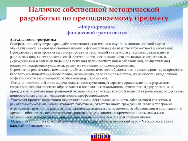 Учитывая процесс подготовки самостоятельной, деятельной личности, обладающей качествами рачительного хозяина, инициативного работника, ответственного гражданина, в этой программе отражается стремление рассмотреть различные аспекты экономического образования и воспитания, с другой – обеспечить целостность восприятия, непрерывность и преемственность социально-экономической подготовки учащихся начальной, основной и полной средней школы.