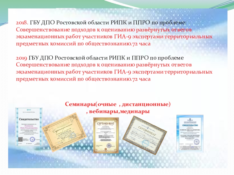 2019 ГБУ ДПО Ростовской области РИПК и ППРО по проблеме Совершенствование подходов к оцениванию развёрнутых ответов экзаменационных работ участников ГИА-9 экспертами территориальных предметных комиссий по обществознанию.72 часа