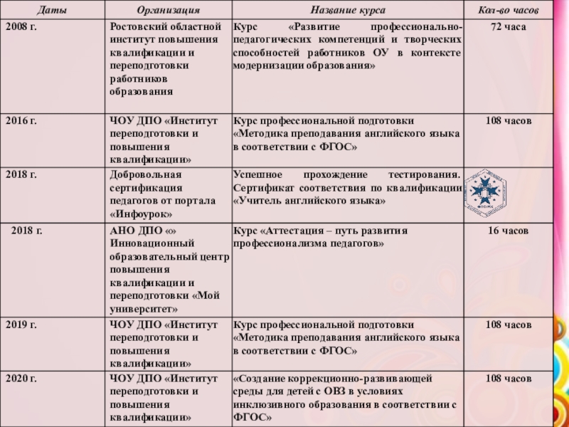 Прохождения курсов повышения квалификации для всестороннего изучения новых методов работы.