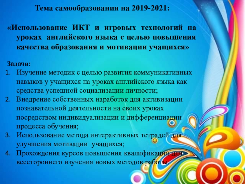Тема самообразования на 2019-2021:«Использование ИКТ и игровых технологий на уроках английского языка с целью повышения качества образования