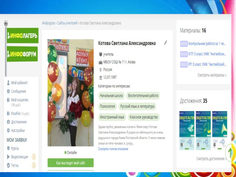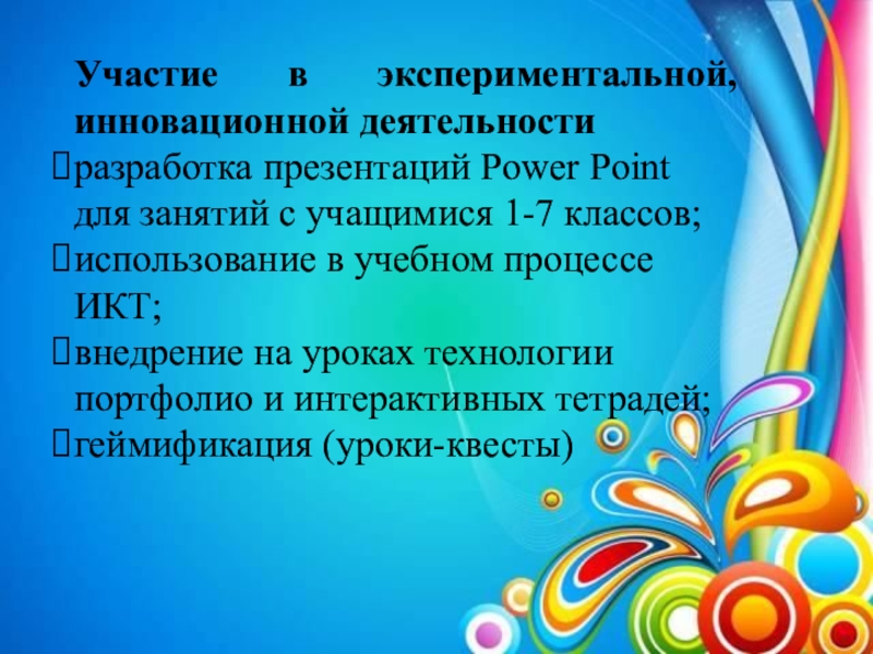 Участие в экспериментальной, инновационной деятельностиразработка презентаций Power Point для занятий с учащимися 1-7 классов;использование в учебном процессе