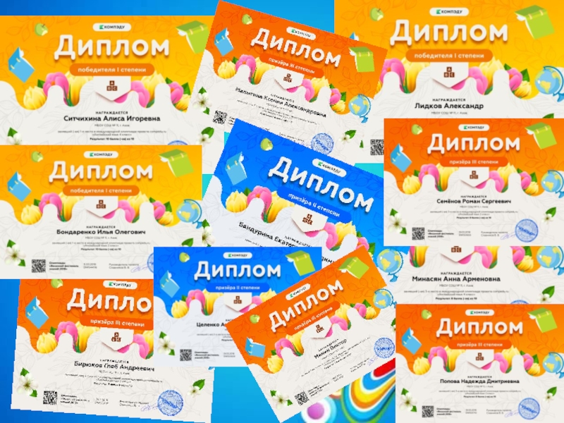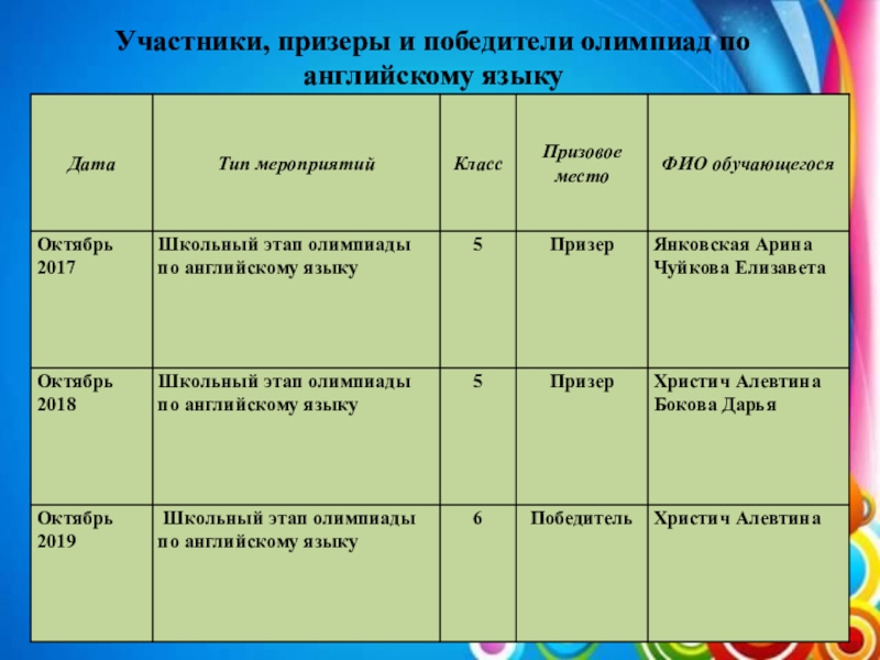 Слайд 12Участники, призеры и победители олимпиад по английскому языку