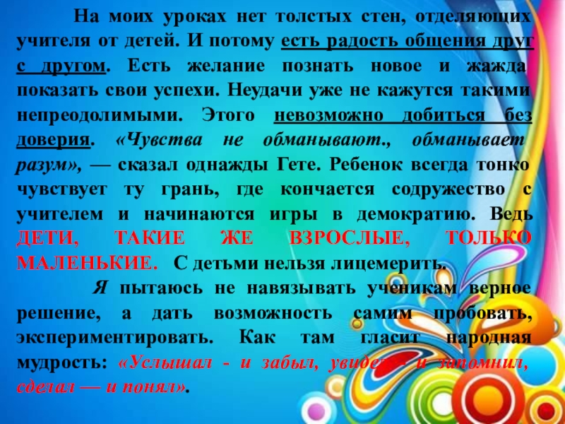 учителя от детей. И потому есть радость общения друг с другом. Есть желание познать новое и жажда показать свои успехи. Неудачи уже не кажутся такими непреодолимыми. Этого невозможно добиться без доверия. «Чувства не обманывают., обманывает разум», — сказал однажды Гете. Ребенок всегда тонко чувствует ту грань, где кончается содружество с учителем и начинаются игры в демократию. Ведь ДЕТИ, ТАКИЕ ЖЕ ВЗРОСЛЫЕ, ТОЛЬКО МАЛЕНЬКИЕ. С детьми нельзя лицемерить.