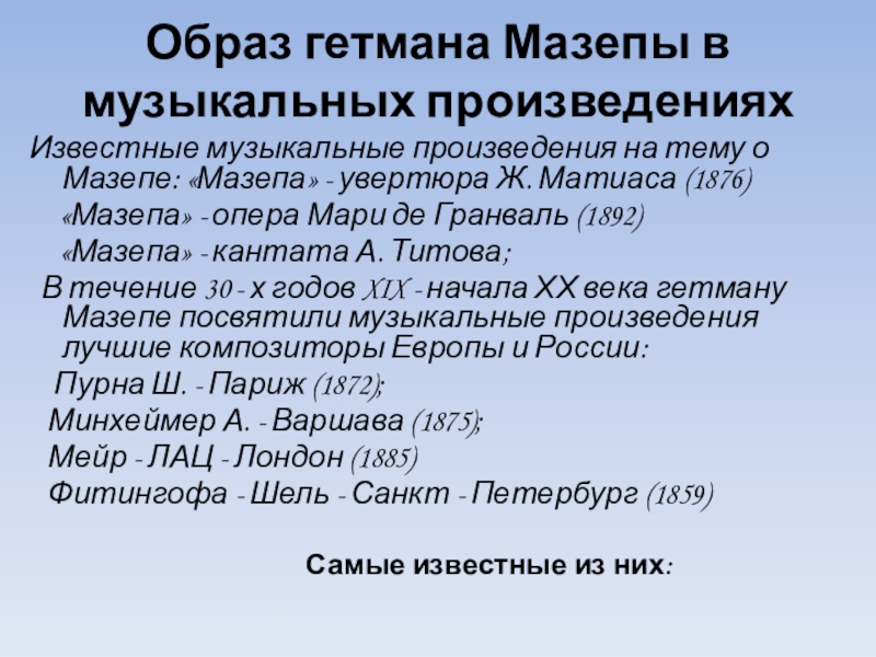 В течение 30 - х годов XIX - начала ХХ века гетману Мазепе посвятили музыкальные произведения лучшие композиторы Европы и России: