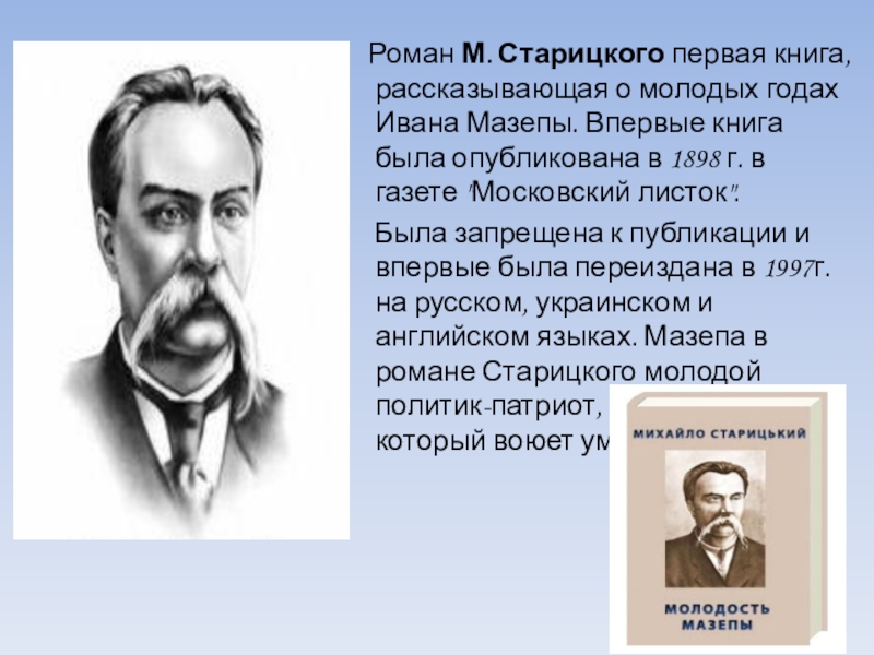 Была запрещена к публикации и впервые была переиздана в 1997г. на русском, украинском и английском языках. Мазепа в романе Старицкого молодой политик-патриот, дипломат и воин, который воюет умом, а не саблей.
