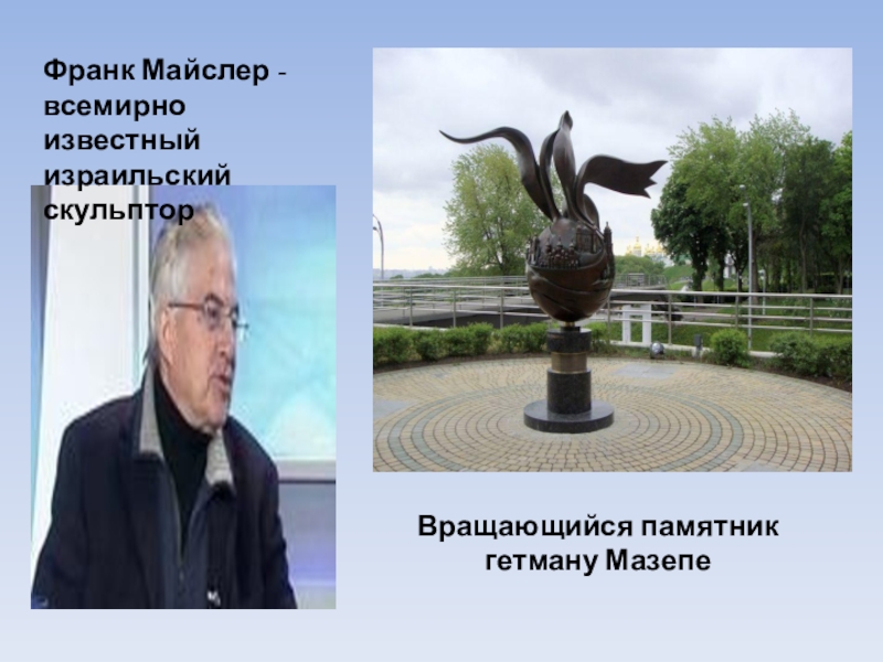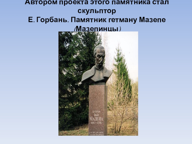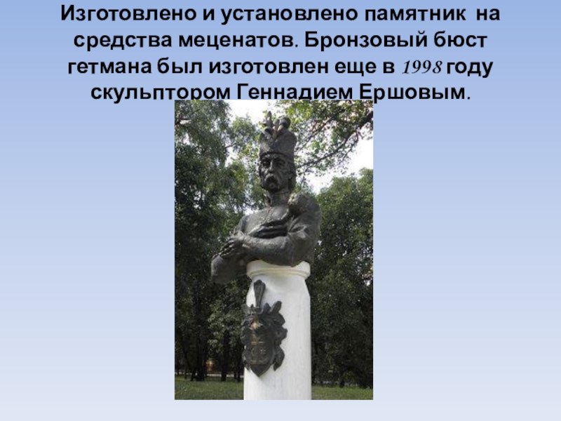 Слайд 36Изготовлено и установлено памятник на средства меценатов. Бронзовый бюст гетмана был