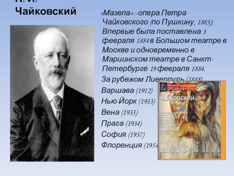 Пушкину, 1883); Впервые была поставлена 3 февраля 1884 в Большом театре в Москве и одновременно в Мариинском театре в Санкт-Петербурге 19 февраля 1884.
