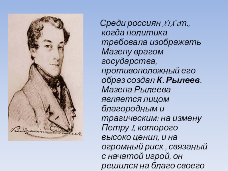 врагом государства, противоположный его образ создал К. Рылеев. Мазепа Рылеева является лицом благородным и трагическим: на измену Петру I, которого высоко ценил, и на огромный риск , связаный с начатой игрой, он решился на благо своего народа.