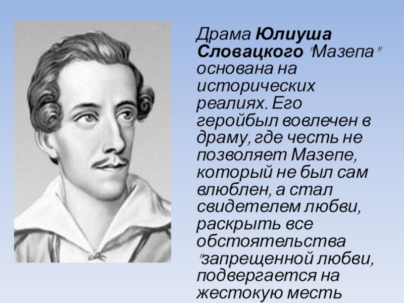 Слайд 13Драма Юлиуша Словацкого "Мазепа" основана на исторических реалиях. Его геройбыл вовлечен