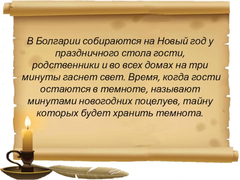 и во всех домах на три минуты гаснет свет. Время, когда гости остаются в темноте, называют минутами новогодних поцелуев, тайну которых будет хранить темнота.