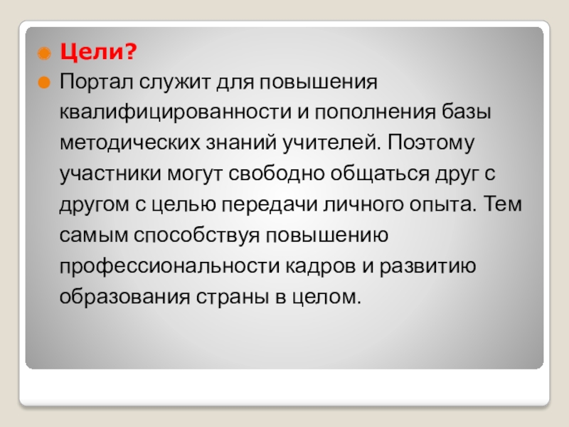 Цели?Портал служит для повышения квалифицированности и пополнения базы методических знаний учителей. Поэтому участники могут свободно общаться друг