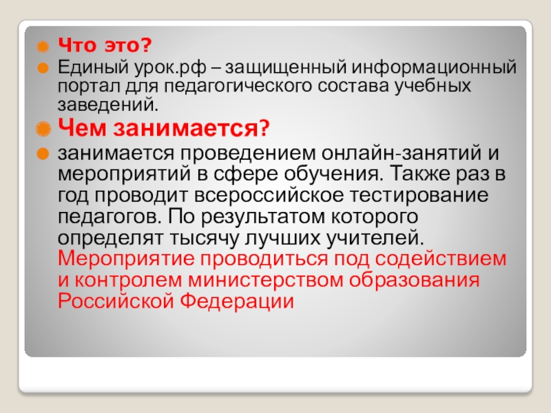Что это?Единый урок.рф – защищенный информационный портал для педагогического состава учебных заведений. Чем занимается?занимается проведением онлайн-занятий и мероприятий в сфере обучения. Также раз в год проводит всероссийское тестирование педагогов. По результатом которого определят тысячу лучших учителей.