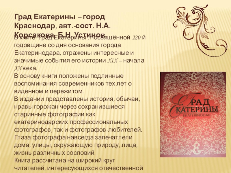 Слайд 20Град Екатерины – город Краснодар, авт.-сост. Н.А. Корсакова, Б.Н. Устинов