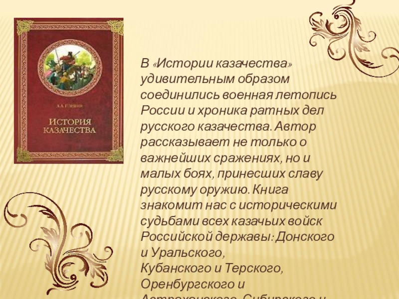 Слайд 22В «Истории казачества» удивительным образом соединились военная летопись России и хроника