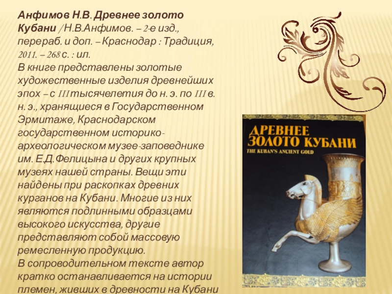 Слайд 28Анфимов Н.В. Древнее золото Кубани / Н.В.Анфимов. – 2-е изд., перераб. и