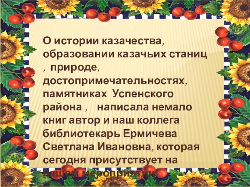 Слайд 29О истории казачества, образовании казачьих станиц , природе, достопримечательностях, памятниках Успенского
