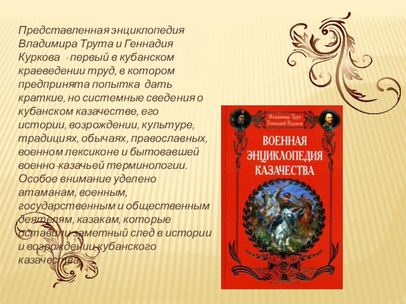 Слайд 21Представленная энциклопедия Владимира Трута и Геннадия Куркова - первый в кубанском