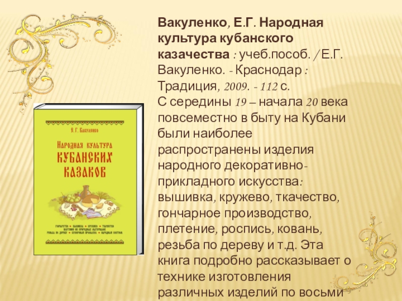 Слайд 32Вакуленко, Е.Г. Народная культура кубанского казачества : учеб.пособ. / Е.Г.Вакуленко. - Краснодар