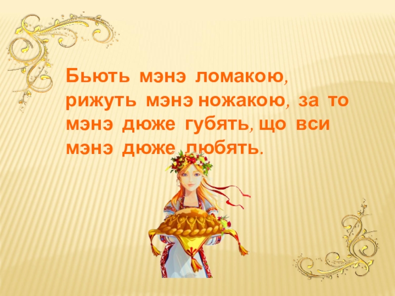 Бьють мэнэ ломакою, рижуть мэнэ ножакою, за то мэнэ дюже губять,