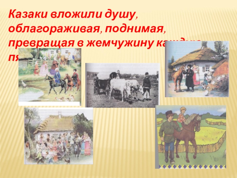 Слайд 13Казаки вложили душу, облагораживая, поднимая, превращая в жемчужину каждую пядь земли.