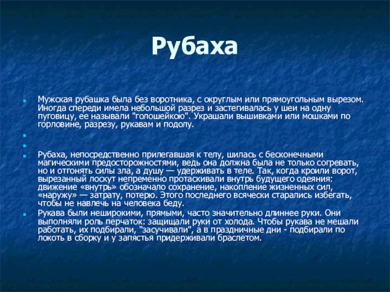 Рубаха, непосредственно прилегавшая к телу, шилась с бесконечными магическими предосторожностями, ведь она должна была не только согревать, но и отгонять силы зла, а душу — удерживать в теле. Так, когда кроили ворот, вырезанный лоскут непременно протаскивали внутрь будущего одеяния: движение «внутрь» обозначало сохранение, накопление жизненных сил, «наружу» — затрату, потерю. Этого последнего всячески старались избегать, чтобы не навлечь на человека беду.