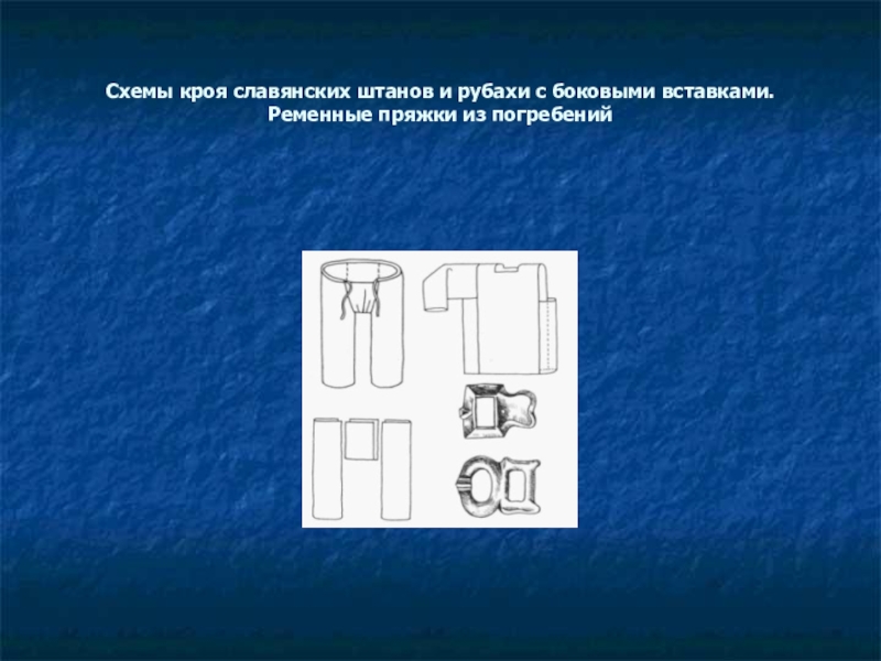 Слайд 10Схемы кроя славянских штанов и рубахи с боковыми вставками. Ременные пряжки из