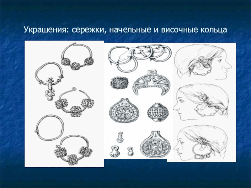 Слайд 18Украшения: сережки, начельные и височные кольца