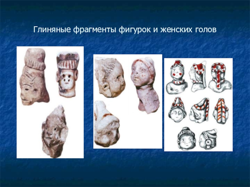 Слайд 19Глиняные фрагменты фигурок и женских голов