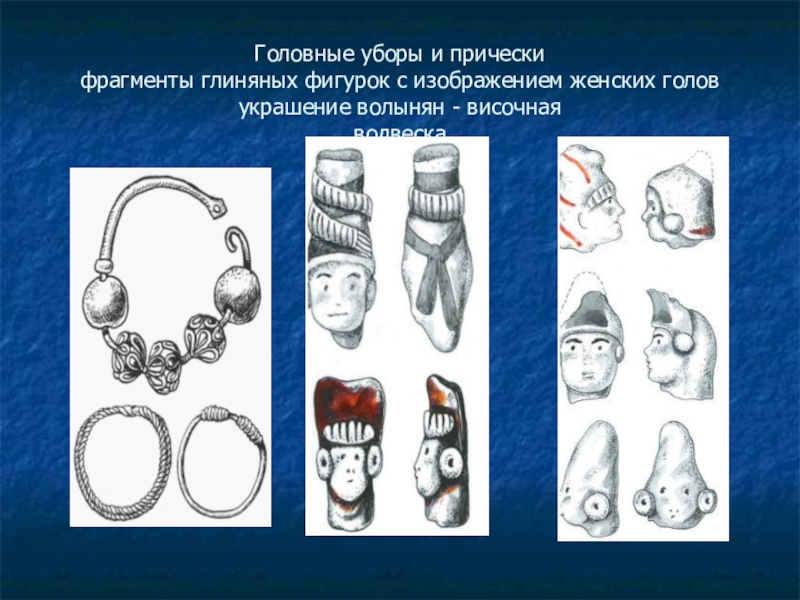 Слайд 15Головные уборы и прически фрагменты глиняных фигурок с изображением женских голов украшение волынян
