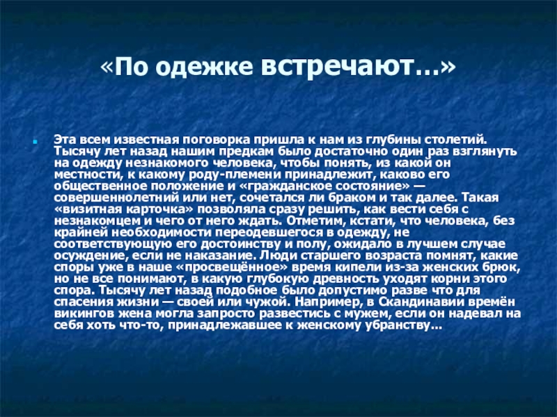 «По одежке встречают…»Эта всем известная поговорка пришла к нам из глубины столетий. Тысячу лет назад нашим предкам было достаточно один раз взглянуть на одежду незнакомого человека, чтобы понять, из какой он местности, к какому роду-племени принадлежит,
