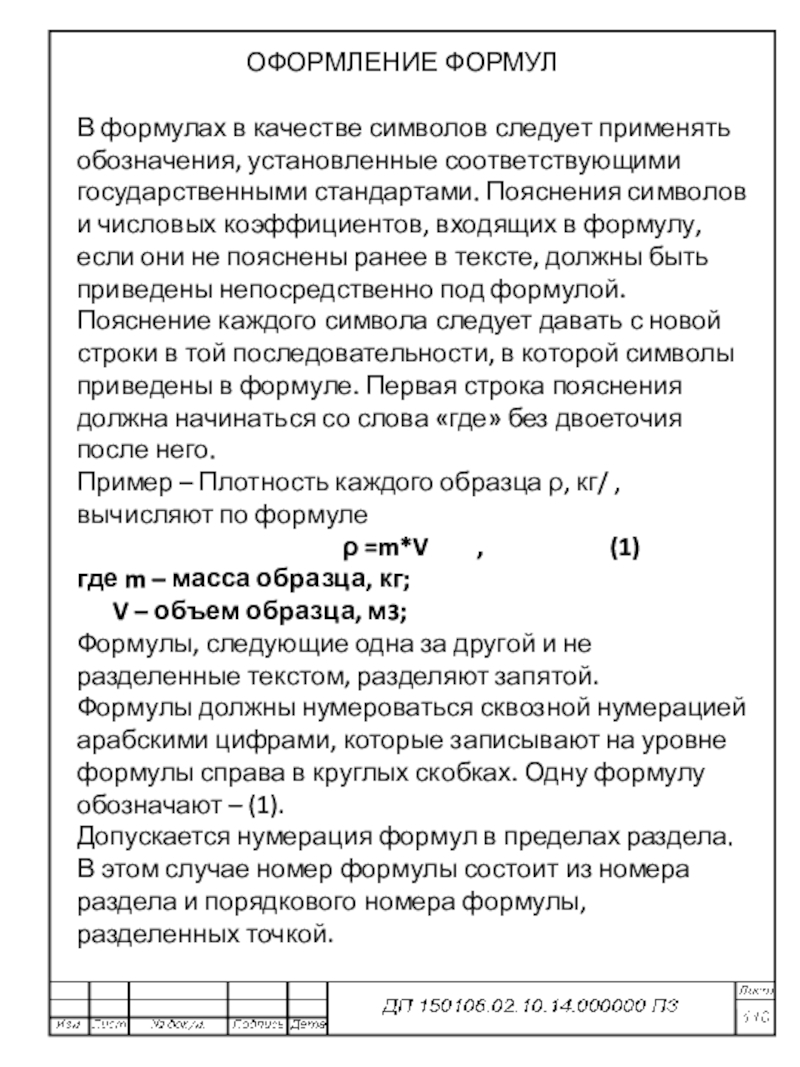 В формулах в качестве символов следует применять обозначения, установленные соответствующими государственными стандартами. Пояснения символов и числовых коэффициентов, входящих в формулу, если они не пояснены ранее в тексте, должны быть приведены непосредственно под формулой. Пояснение каждого символа следует давать с новой строки в той последовательности, в которой символы приведены в формуле. Первая строка пояснения должна начинаться со слова «где» без двоеточия после него.
