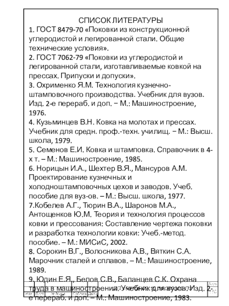 7.Кобелев А.Г., Тюрин В.А., Шаронов М.А., Антощенков Ю.М. Теория и технология процессов ковки и прессования: Составление чертежа поковки и разработка технологии ковки: Учеб.-метод. пособие. – М.: МИСиС, 2002.