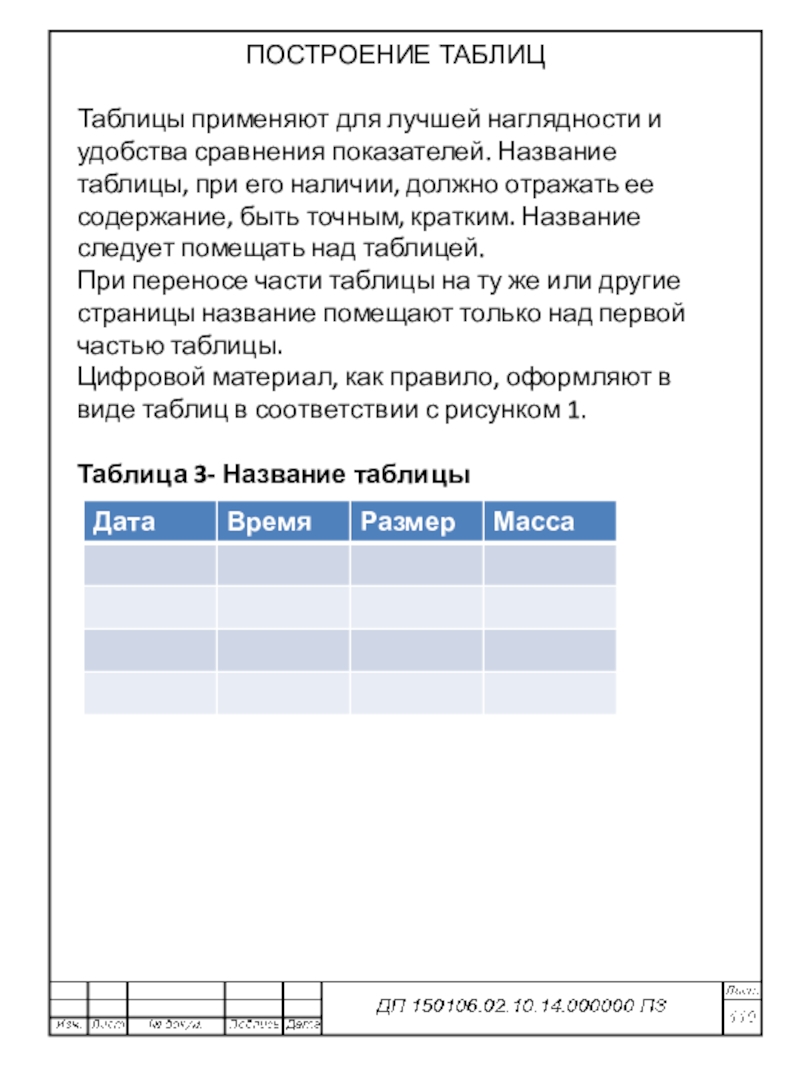 Таблицы применяют для лучшей наглядности и удобства сравнения показателей. Название таблицы, при его наличии, должно отражать ее содержание, быть точным, кратким. Название следует помещать над таблицей.