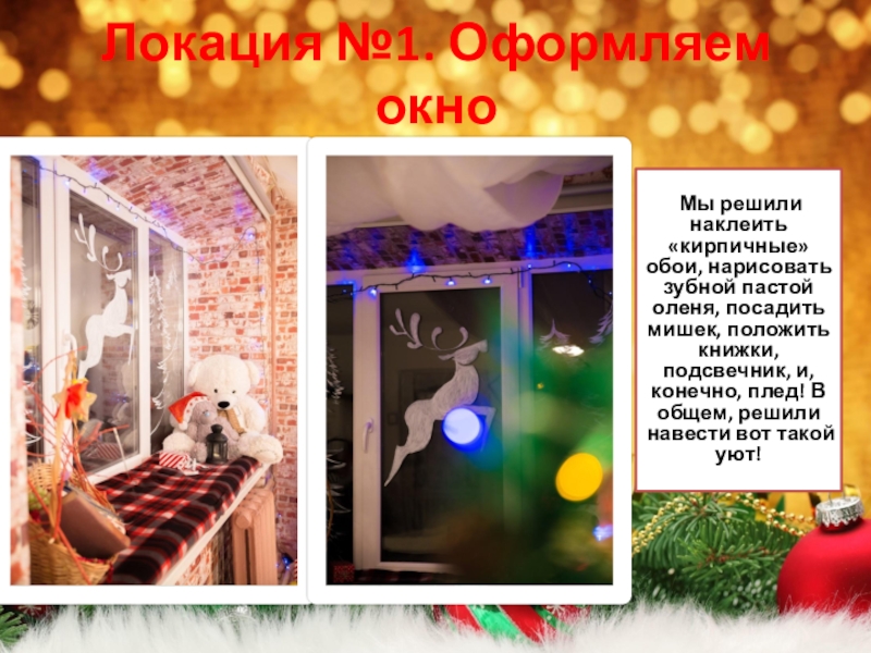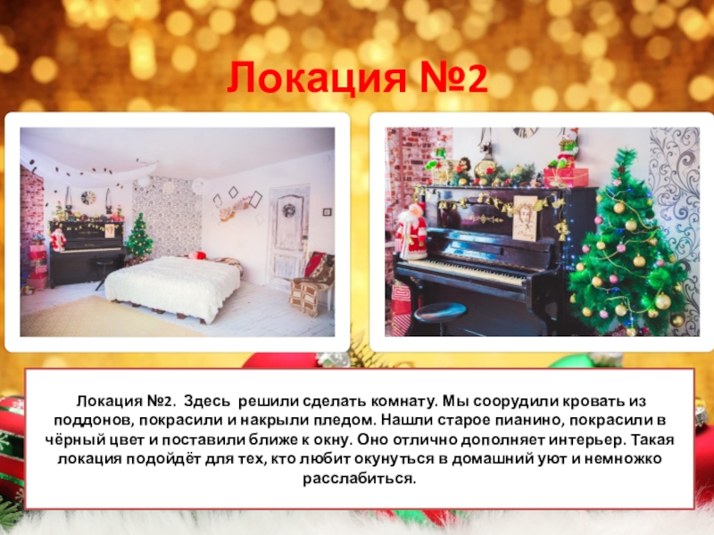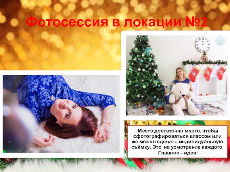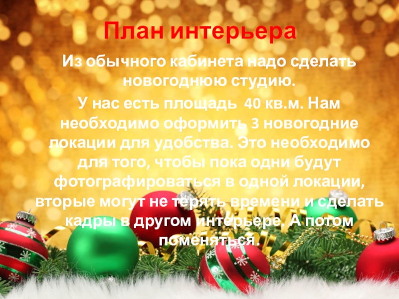 площадь 40 кв.м. Нам необходимо оформить 3 новогодние локации для удобства. Это необходимо для того, чтобы пока одни будут фотографироваться в одной локации, вторые могут не терять времени и сделать кадры в другом интерьере. А потом поменяться.
