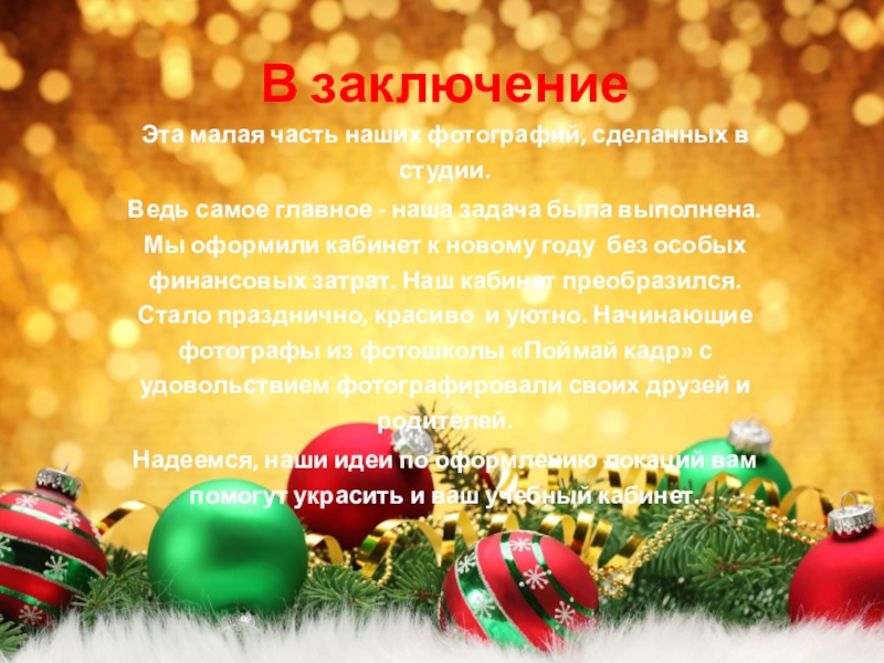 главное - наша задача была выполнена. Мы оформили кабинет к новому году без особых финансовых затрат. Наш кабинет преобразился. Стало празднично, красиво и уютно. Начинающие фотографы из фотошколы «Поймай кадр» с удовольствием фотографировали своих друзей и родителей.