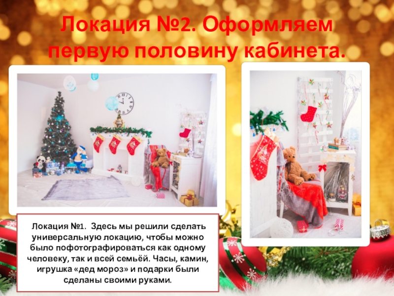 сделать универсальную локацию, чтобы можно было пофотографироваться как одному человеку, так и всей семьёй. Часы, камин, игрушка «дед мороз» и подарки были сделаны своими руками.