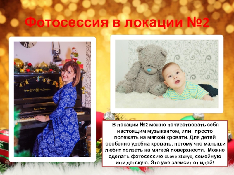 музыкантом, или просто полежать на мягкой кровати. Для детей особенно удобна кровать, потому что малыши любят ползать на мягкой поверхности. Можно сделать фотосессию «Love Story», семейную или детскую. Это уже зависит от идей!