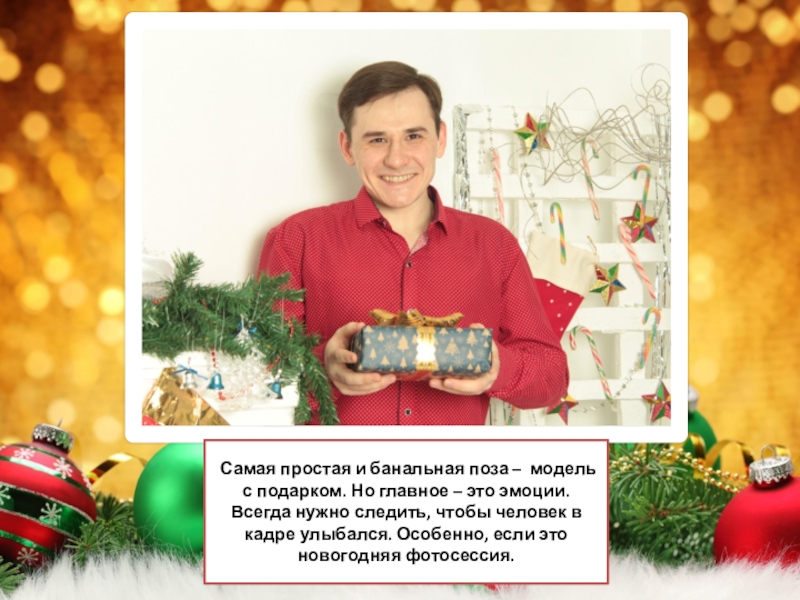Слайд 14 Самая простая и банальная поза – модель с подарком. Но