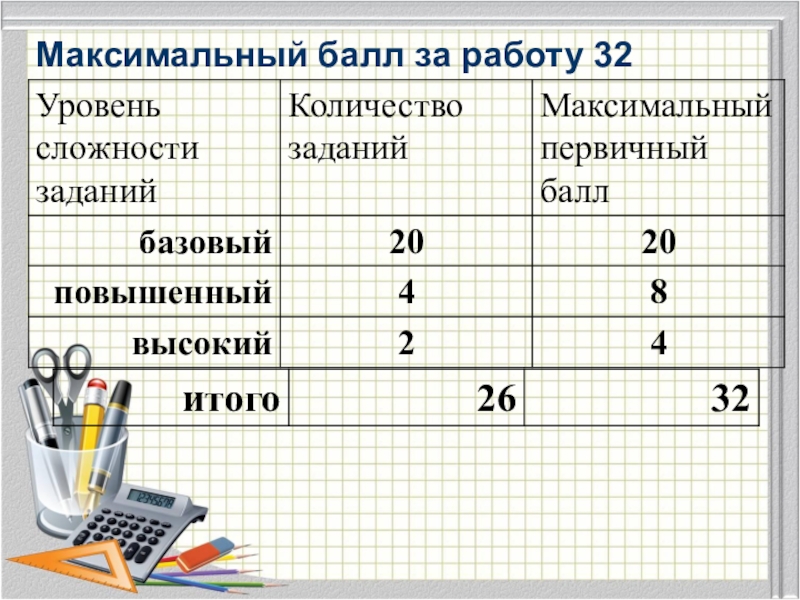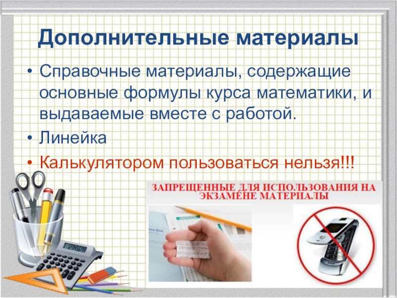 Дополнительные материалыСправочные материалы, содержащие основные формулы курса математики, и выдаваемые вместе с работой.ЛинейкаКалькулятором пользоваться нельзя!!!