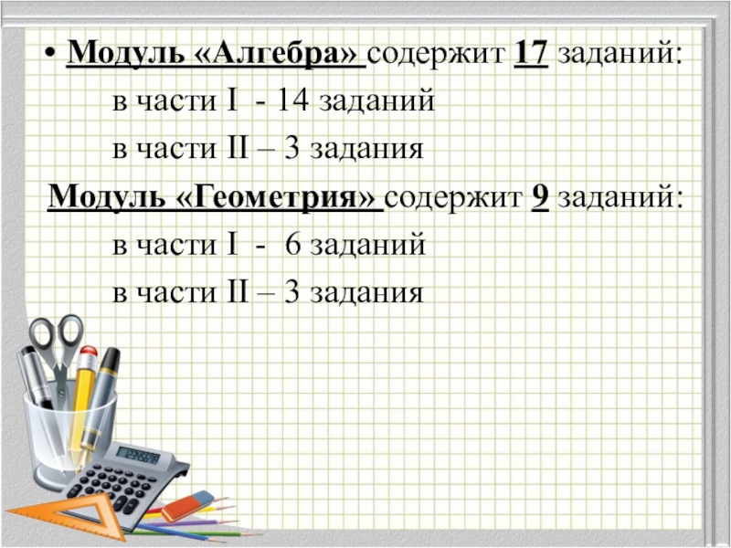Модуль «Алгебра» содержит 17 заданий:		в части I - 14 заданий		в части II – 3 задания Модуль «Геометрия»