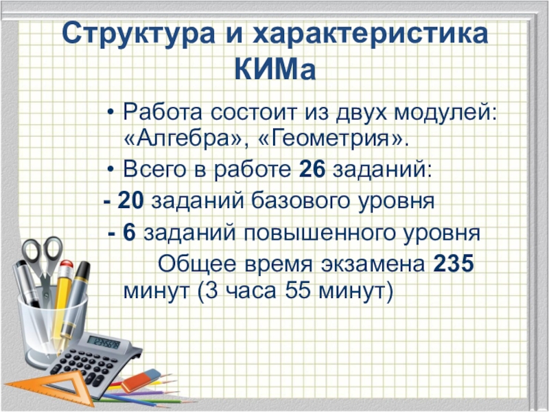 Структура и характеристика КИМаРабота состоит из двух модулей: «Алгебра», «Геометрия». Всего в работе 26 заданий:- 20 заданий базового уровня 6 заданий повышенного уровня Общее время экзамена 235 минут (3 часа 55 минут)