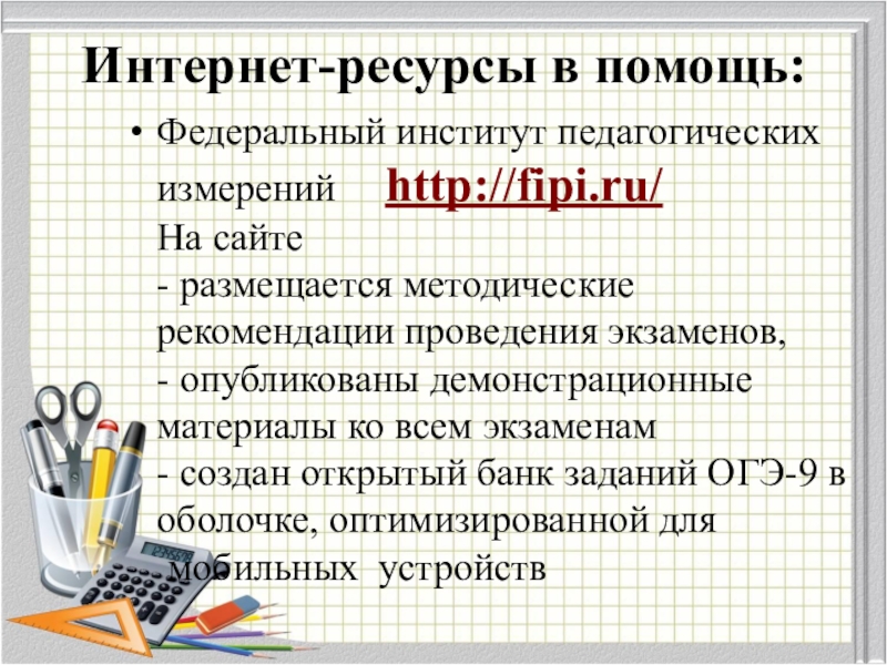 Интернет-ресурсы в помощь:Федеральный институт педагогических измерений   http://fipi.ru/ На сайте - размещается методические рекомендации проведения экзаменов,