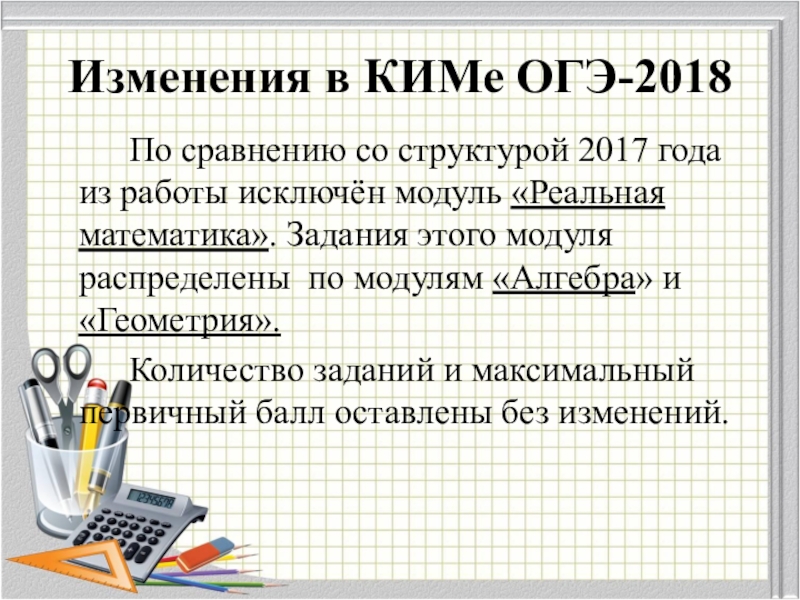 Изменения в КИМе ОГЭ-2018		По сравнению со структурой 2017 года из работы исключён модуль «Реальная математика». Задания этого