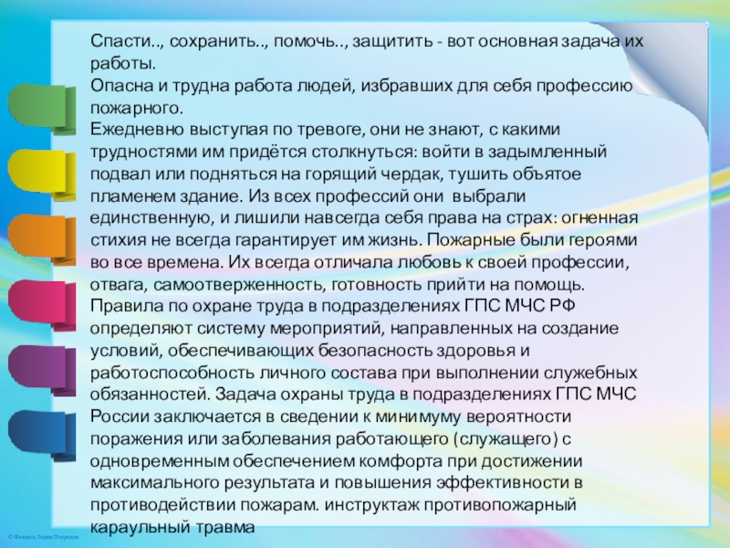 Правила по охране труда в подразделениях ГПС МЧС РФ определяют систему мероприятий, направленных на создание условий, обеспечивающих безопасность здоровья и работоспособность личного состава при выполнении служебных обязанностей. Задача охраны труда в подразделениях ГПС МЧС России заключается в сведении к минимуму вероятности поражения или заболевания работающего (служащего) с одновременным обеспечением комфорта при достижении максимального результата и повышения эффективности в противодействии пожарам. инструктаж противопожарный караульный травма