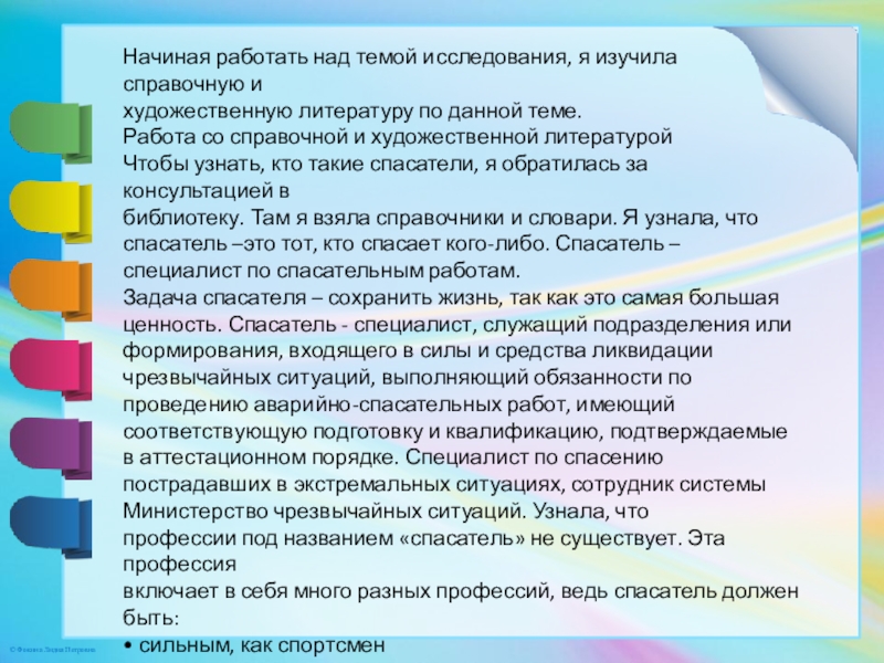 библиотеку. Там я взяла справочники и словари. Я узнала, что спасатель –это тот, кто спасает кого-либо. Спасатель – специалист по спасательным работам.